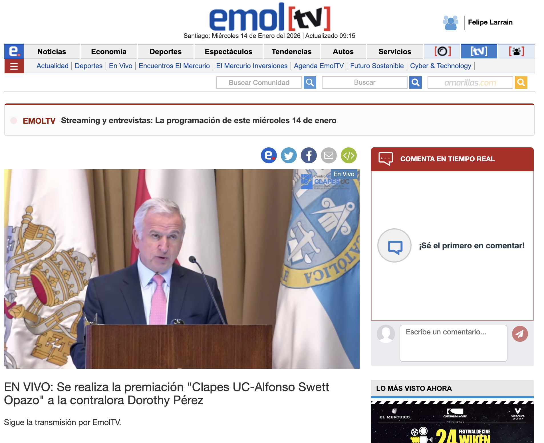 Emol TV transmite premiación "Clapes UC-Alfonso Swett Opazo" a la contralora Dorothy Pérez