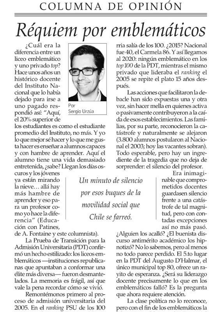 ¿Cuál era la diferencia entre un liceo emblemático y uno privado top? Hace unos años un histórico docente del Instituto Nacional que lo había dejado para irse a uno pagado respondió así: “Aquí, el 20% superior de los estudiantes es como el estudiante promedio del Instituto, no más. Y yo lo que mejor sé hacer y lo que me gústa hacer es enseñar a alumnos capaces y con hambre de aprender. Aquí el alumno tiene una vida demasiado entretenida, ¿sabe? Llegan los días oscuros y los jóvenes ya están mirando la nieve... allá hay más hambre de aprender y eso para un profesor como yo hace la diferencia (Educación con Patines, de A. Fontaine y este columnista).