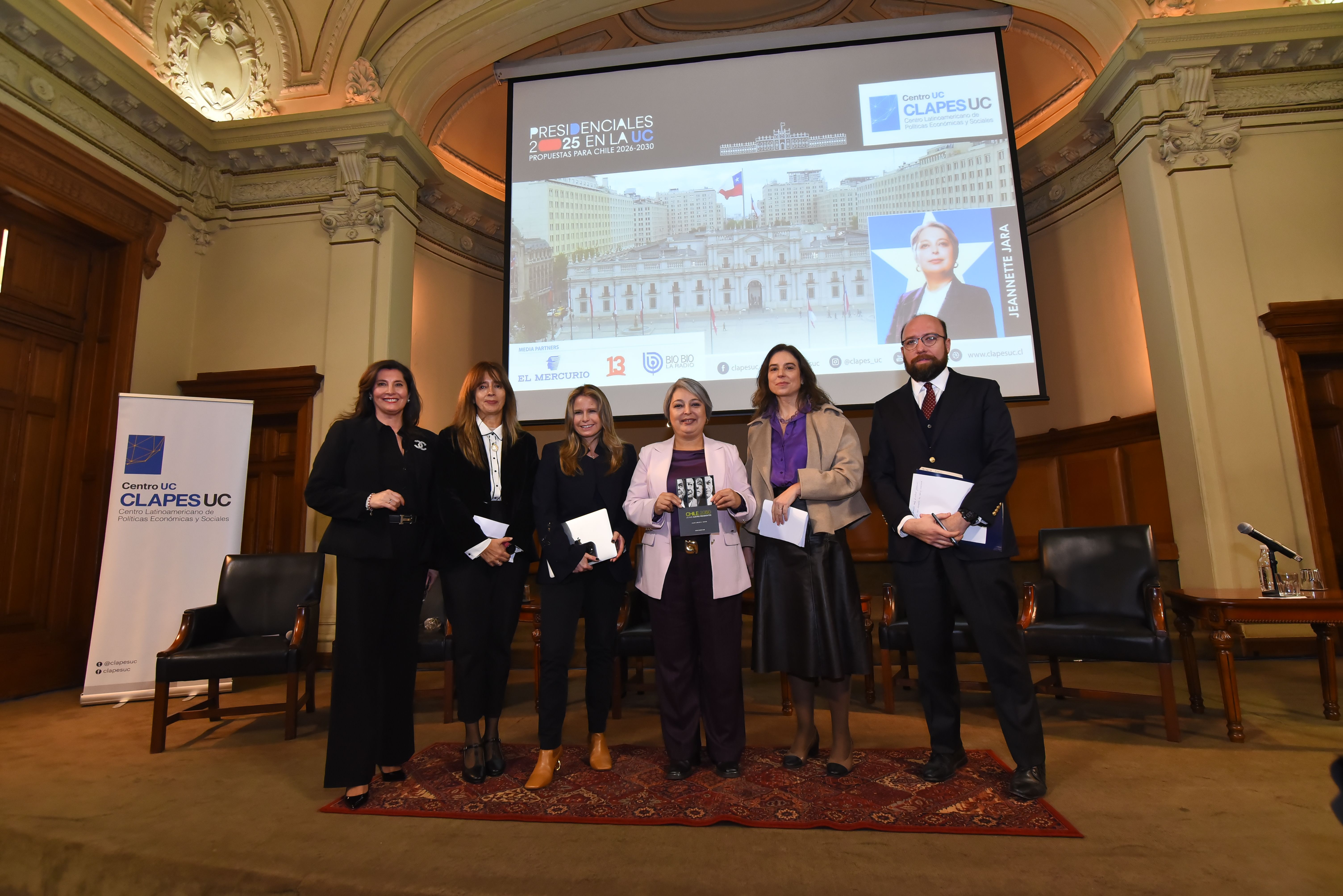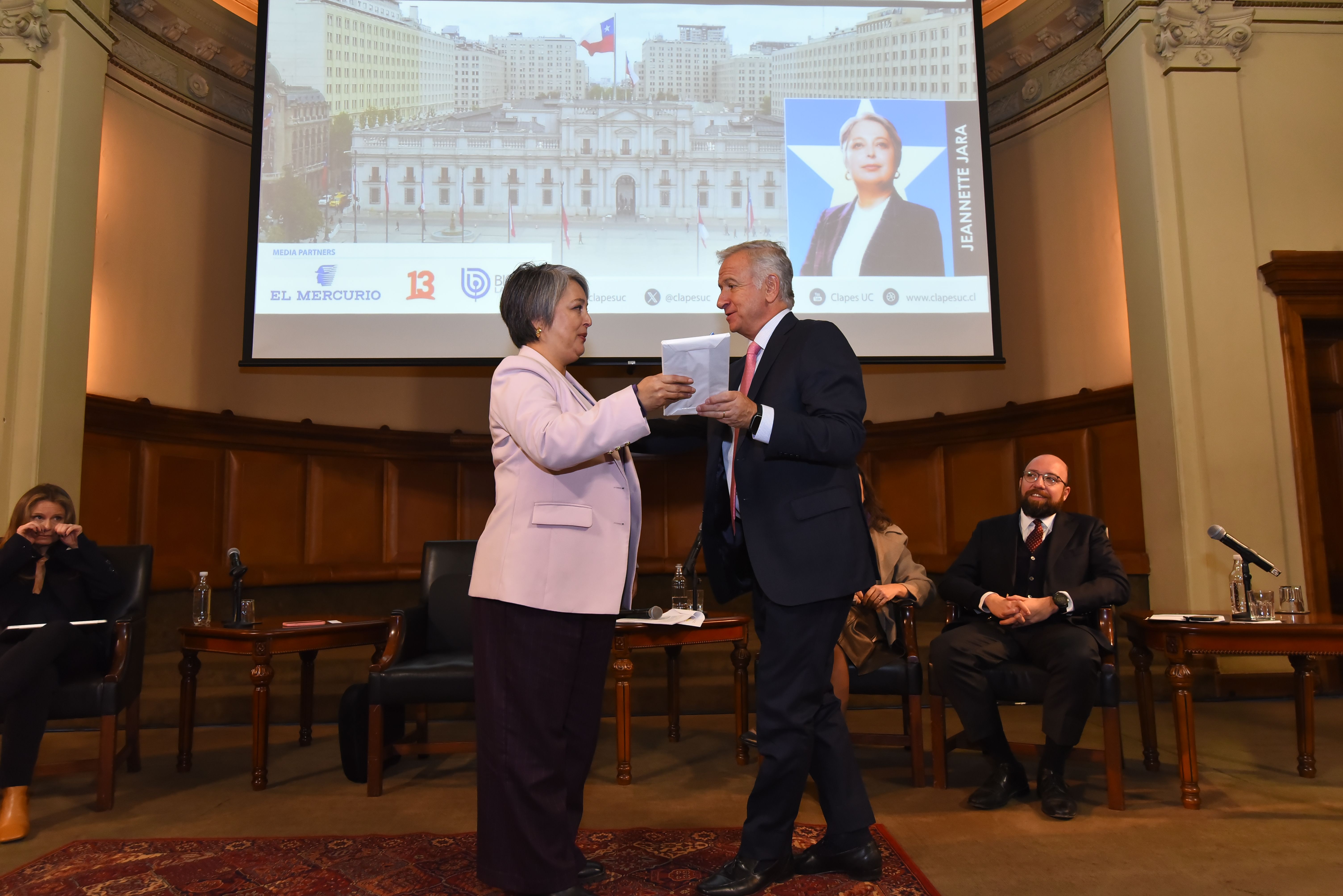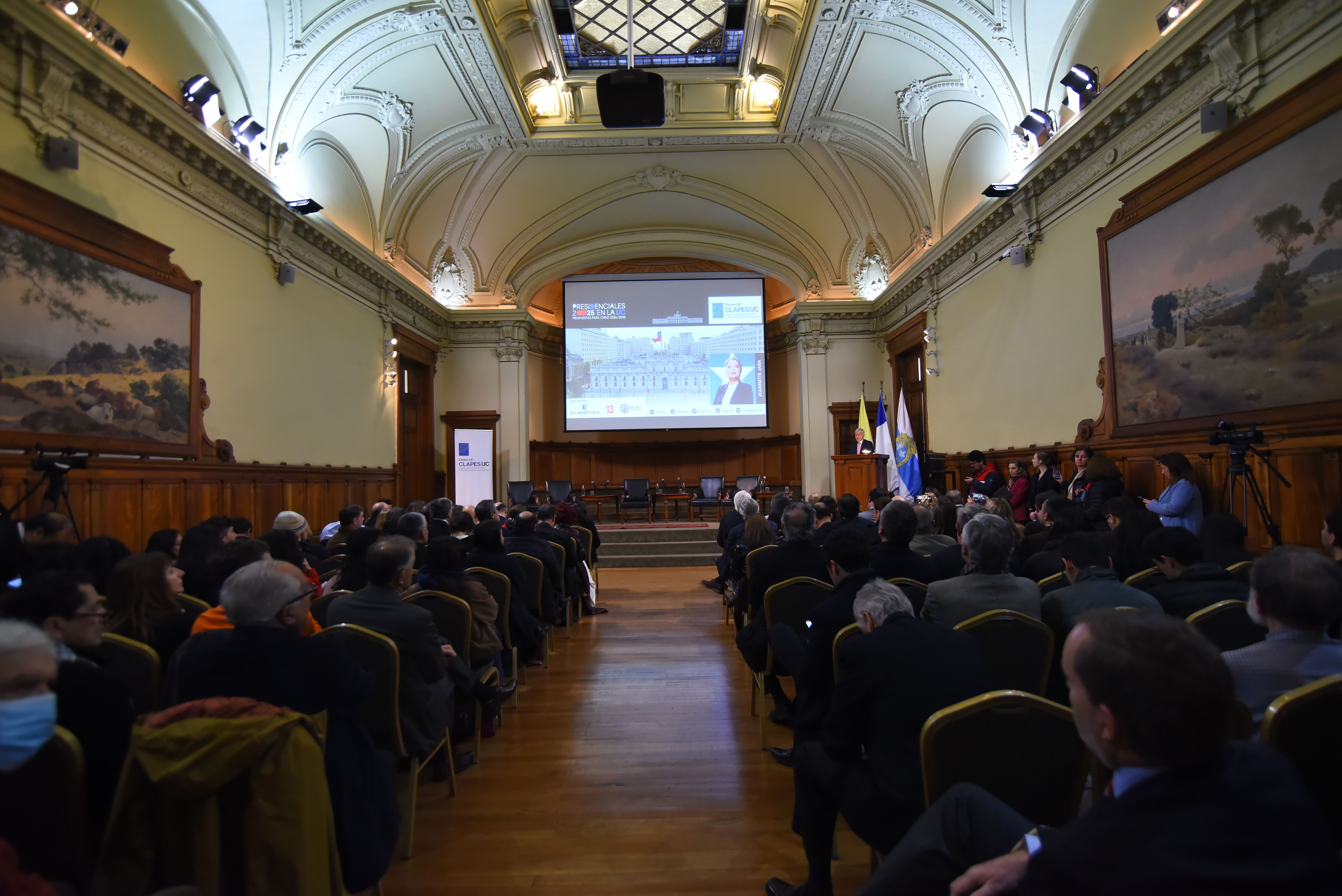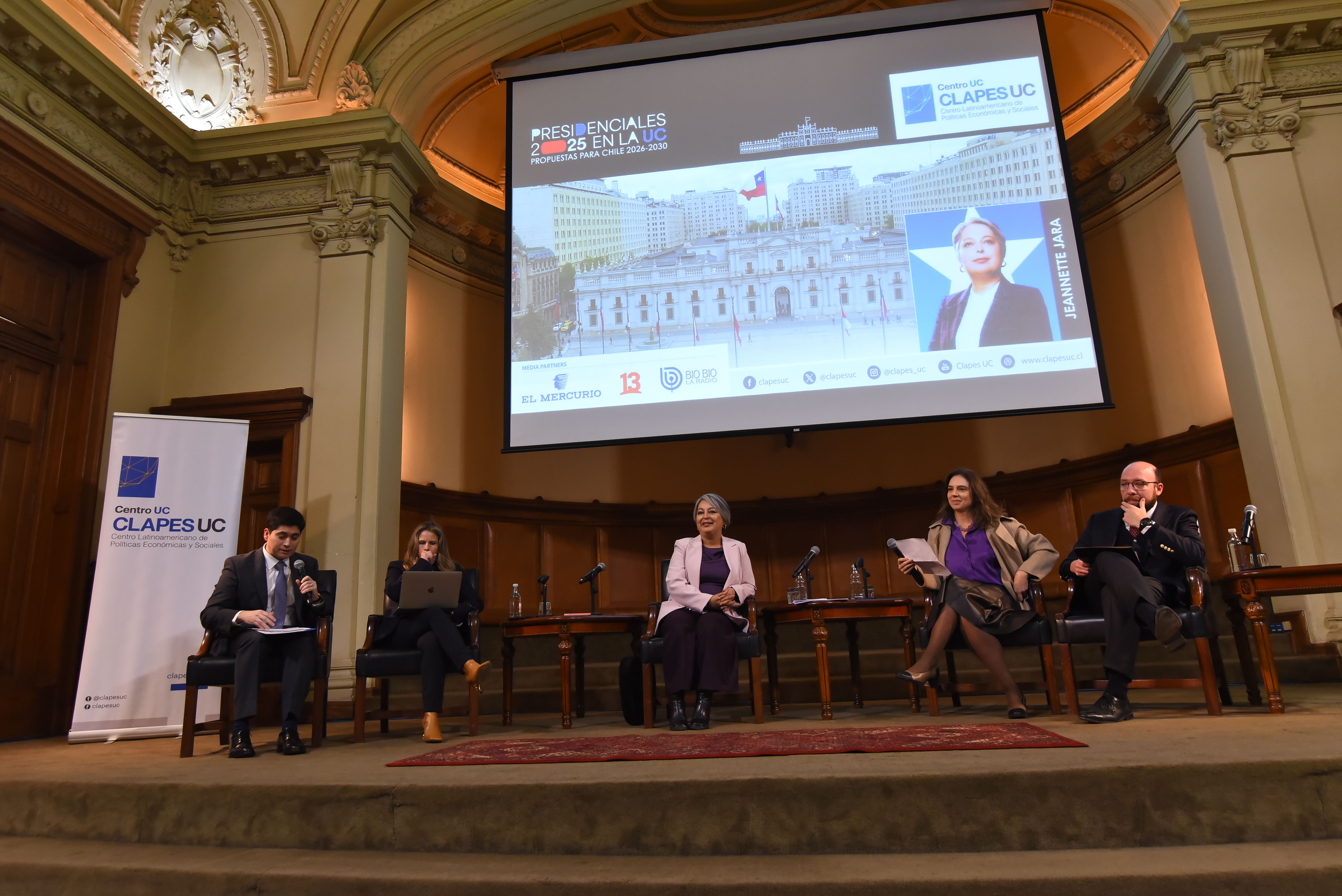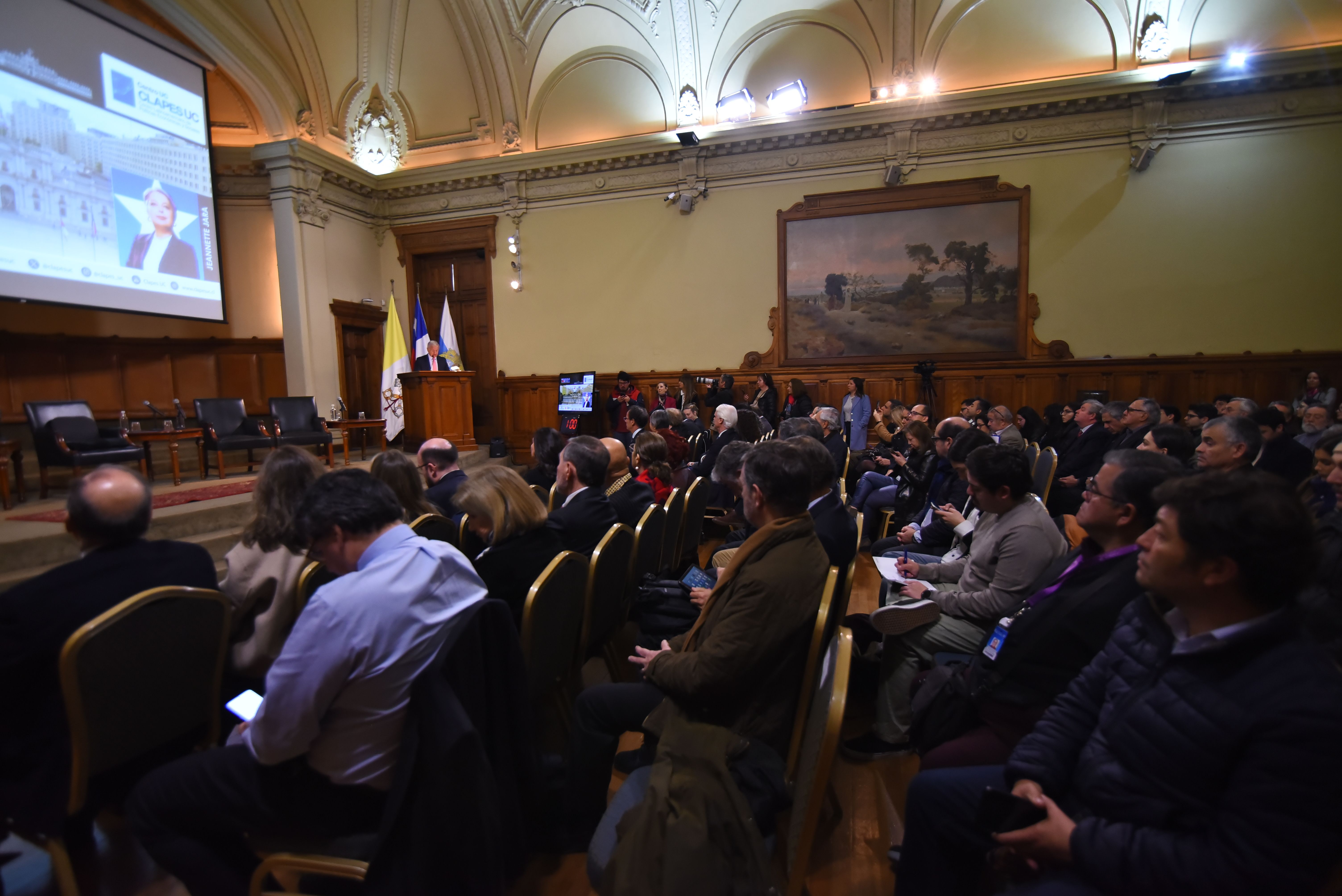 El encuentro dio inicio con las palabras introductorias del director de CLAPES UC , Felipe Larraín, seguido de la exposición de la candidata presidencial del Oficialismo , Jeannette Jara.