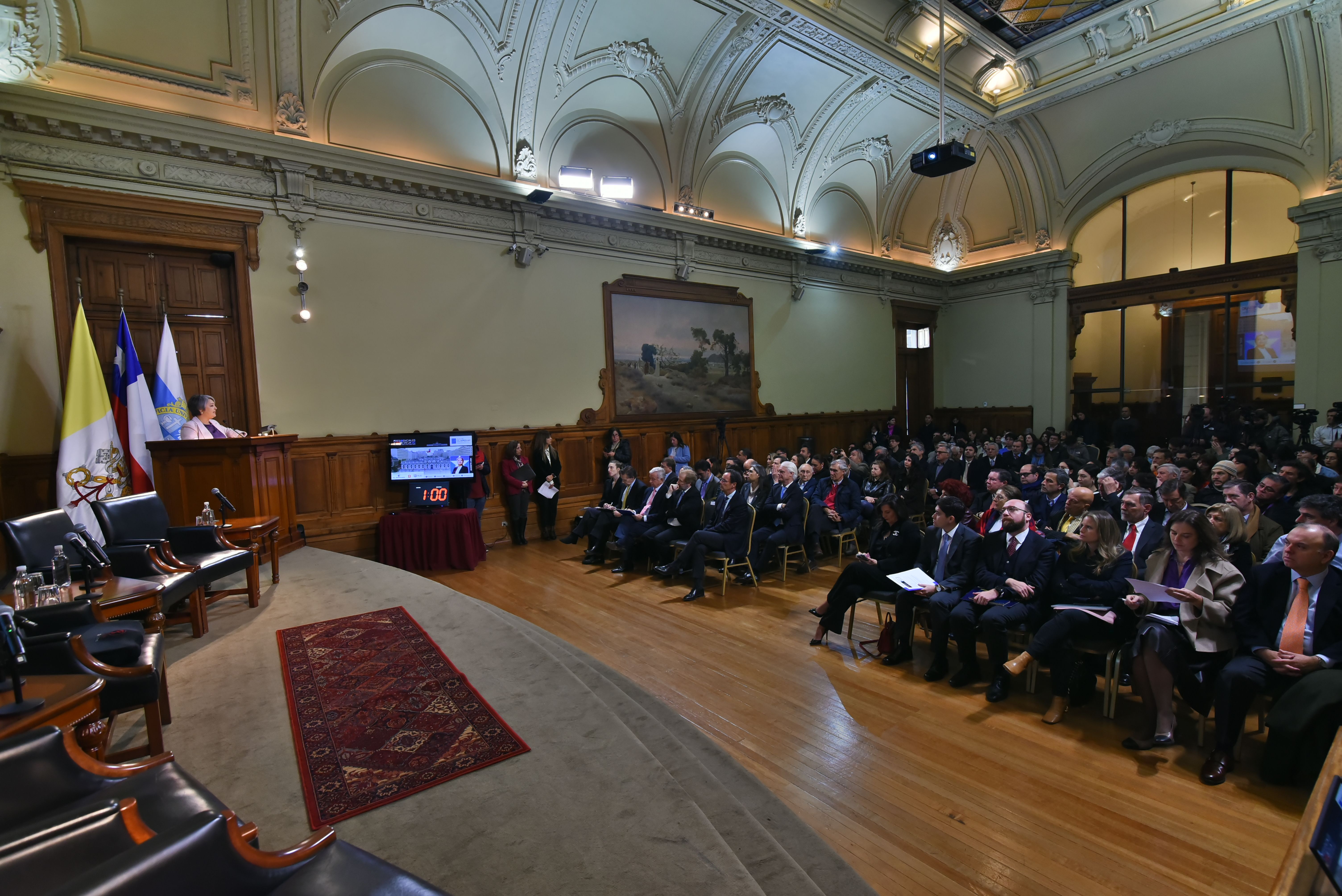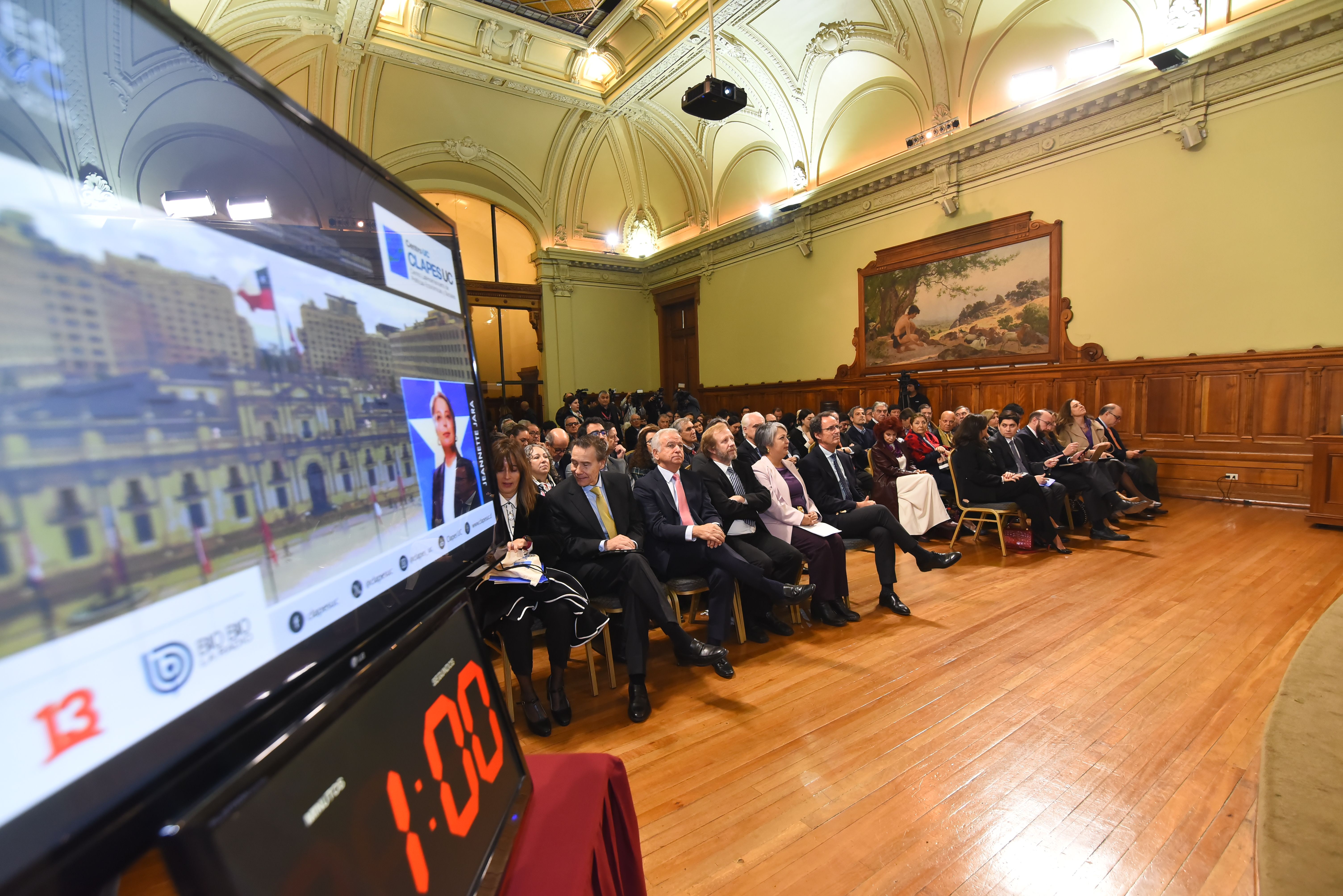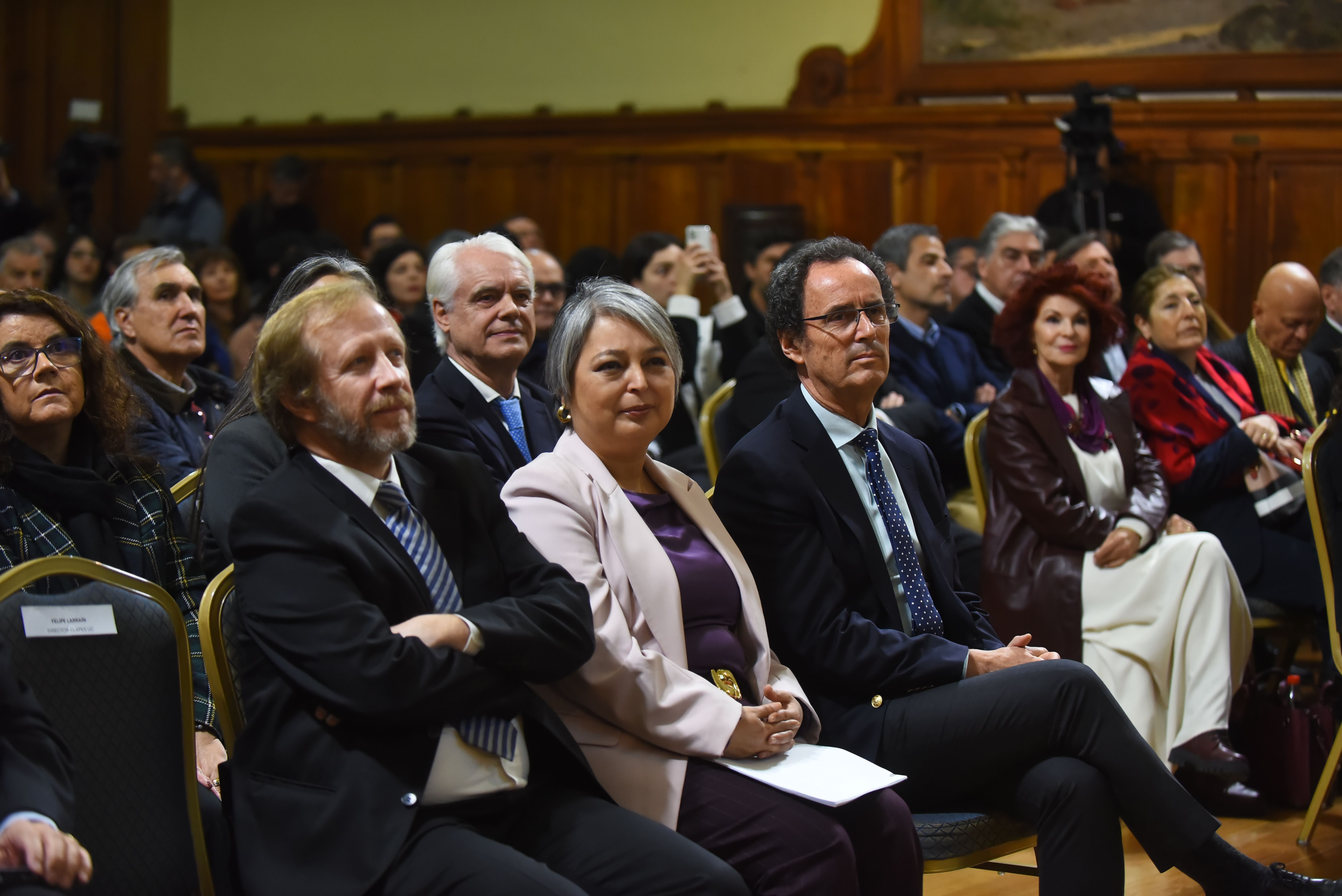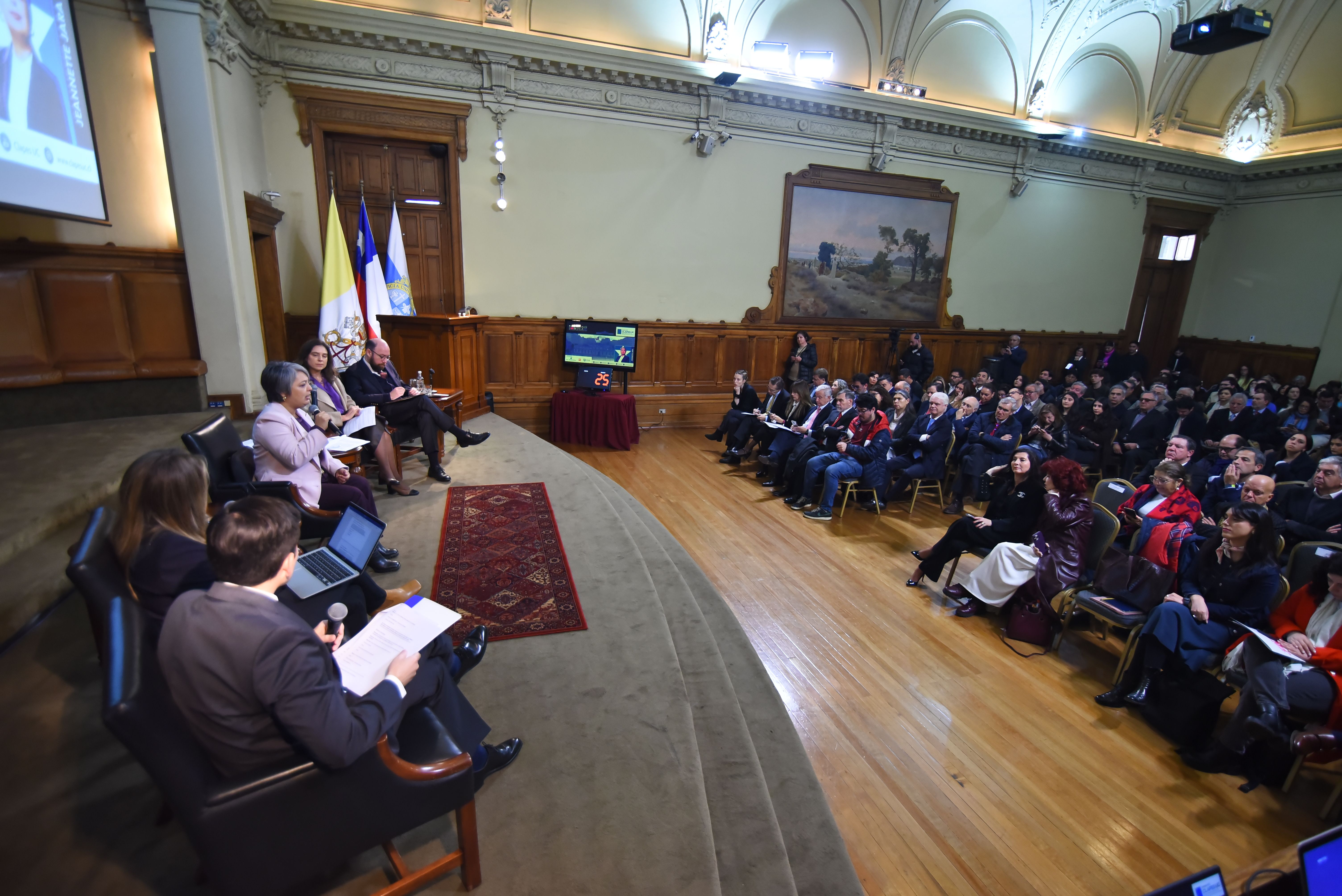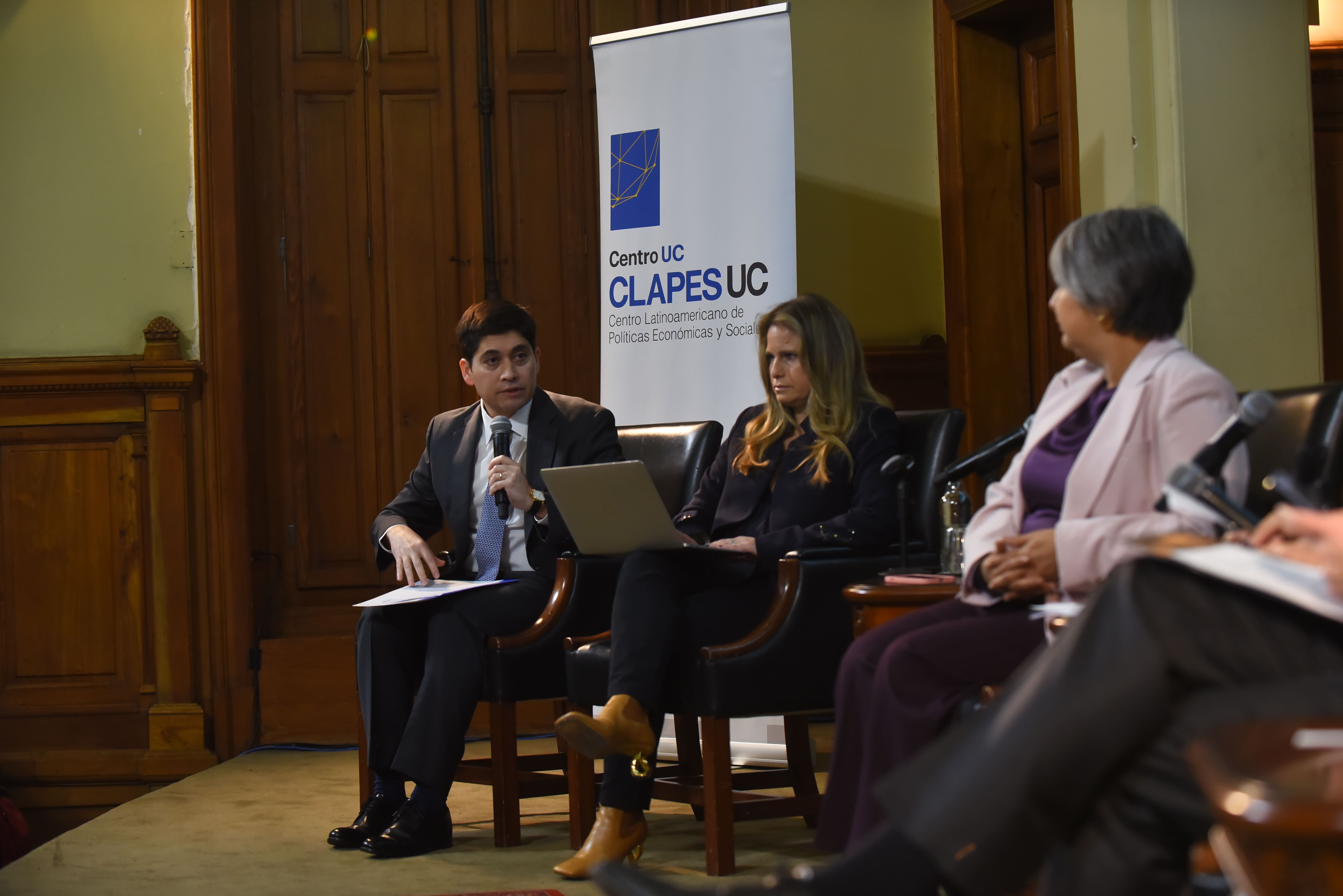 El encuentro dio inicio con las palabras introductorias del director de CLAPES UC , Felipe Larraín, seguido de la exposición de la candidata presidencial del Oficialismo , Jeannette Jara.