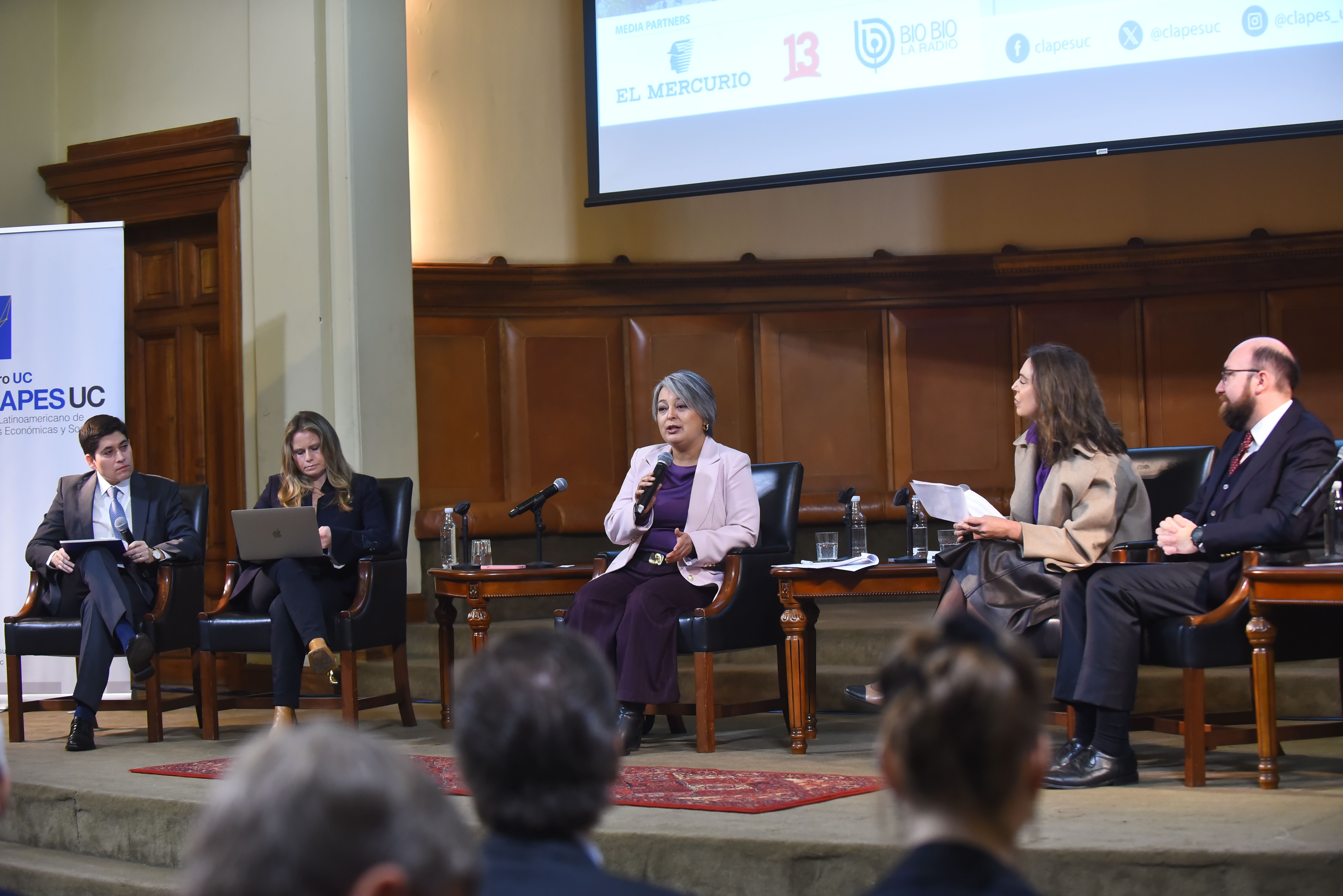 Luego se abrió un panel de diálogo con nuestros media partners: El Mercurio, Canal 13 y Radio BioBio representados por los periodistas: los periodistas María Soledad Vial de @Emol (editora de Economía y Negocios Domingo), Néstor Aburto de @biobio (director de contenidos editoriales) y Soledad Onetto de @canal13 (conductora y periodista), quienes generaron una dinámica de 3 módulos con preguntas sobre temas relevantes para Chile a la candidata, con la moderación del coordinador macroeconómico de CLAPES UC , Hermann González; la coordinadora legal de CLAPES UC , Karin Moore y la directora de comunicaciones CLAPES UC , Marta Sánchez .